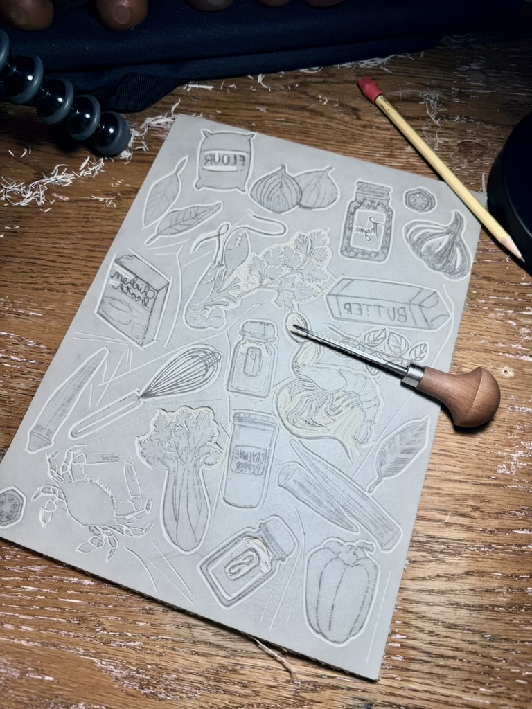 hand carved with Pfeil tools, inked with Cranfield Relief and Safe Wash ink, pressed with a cold press laminator.